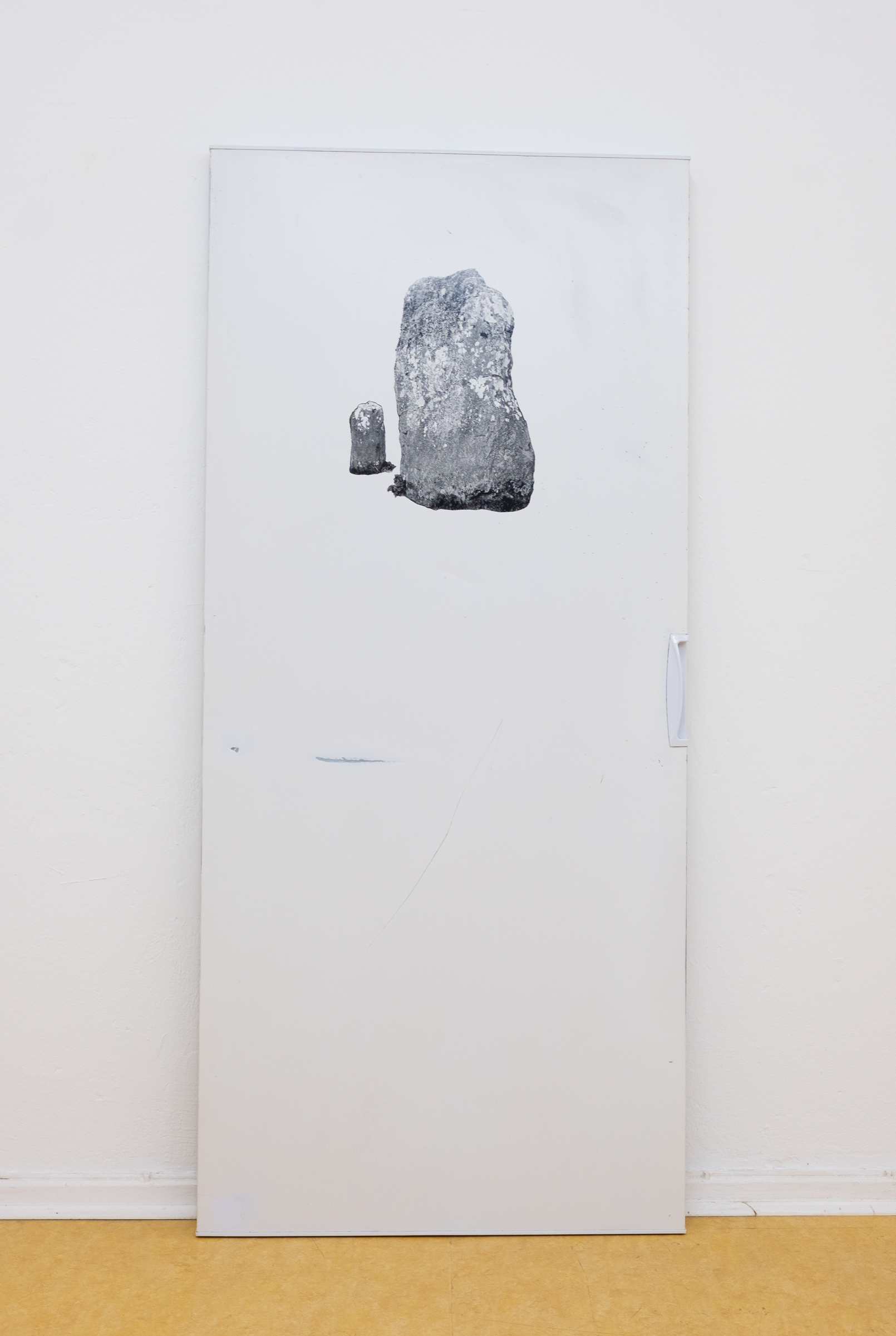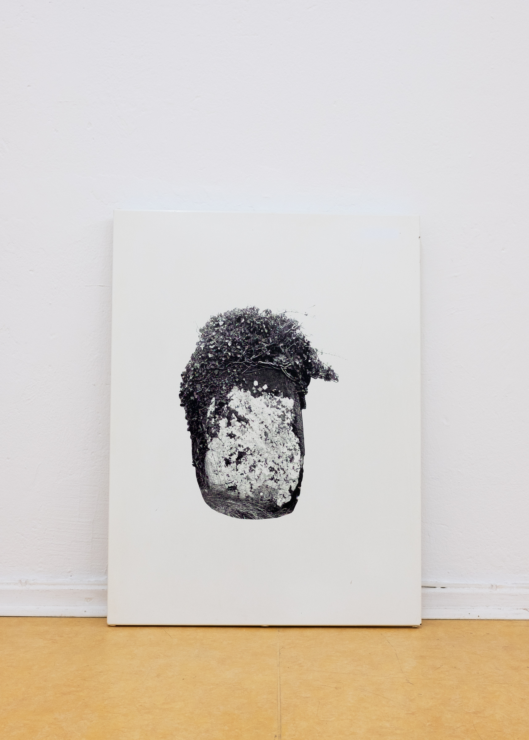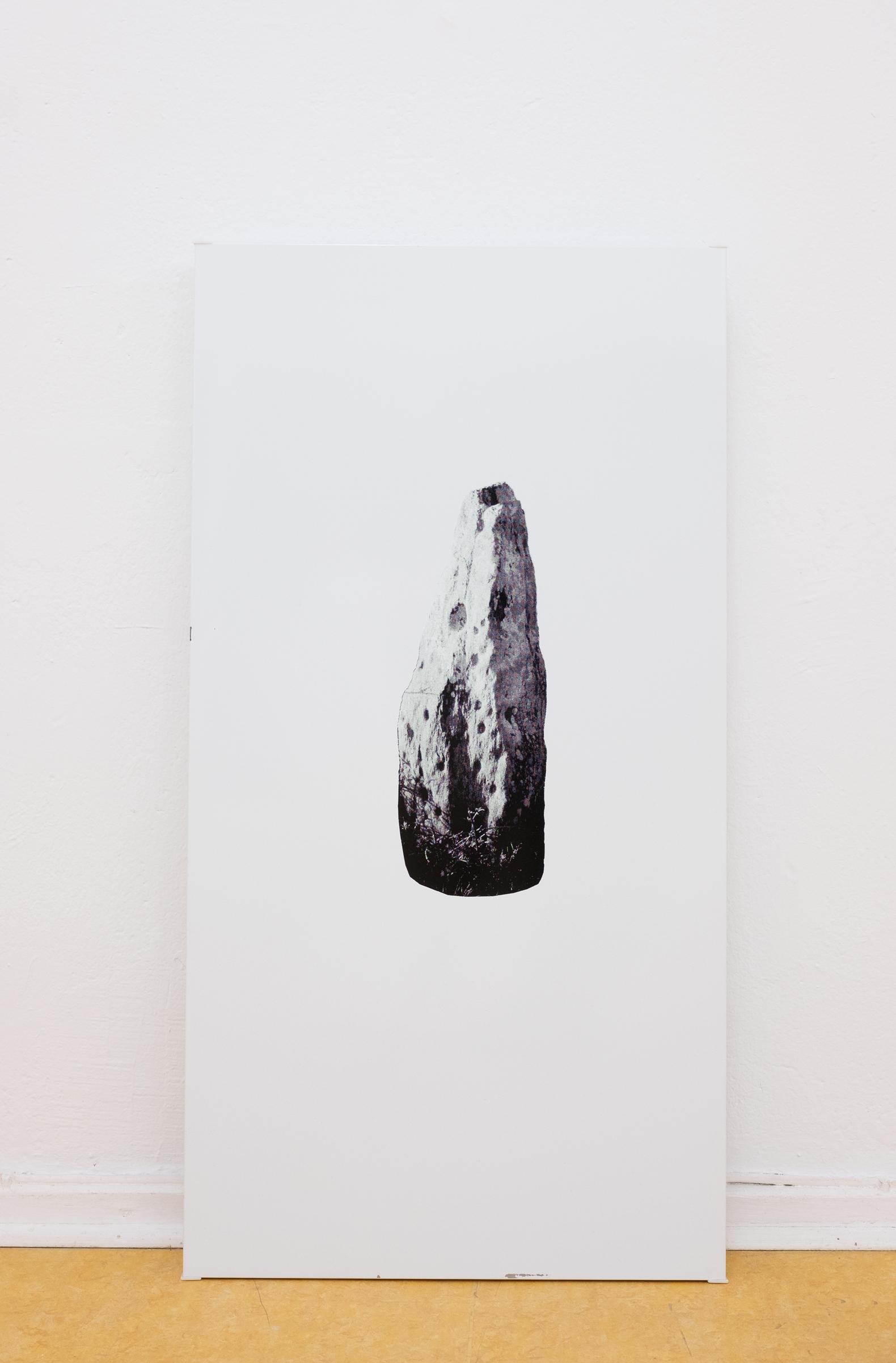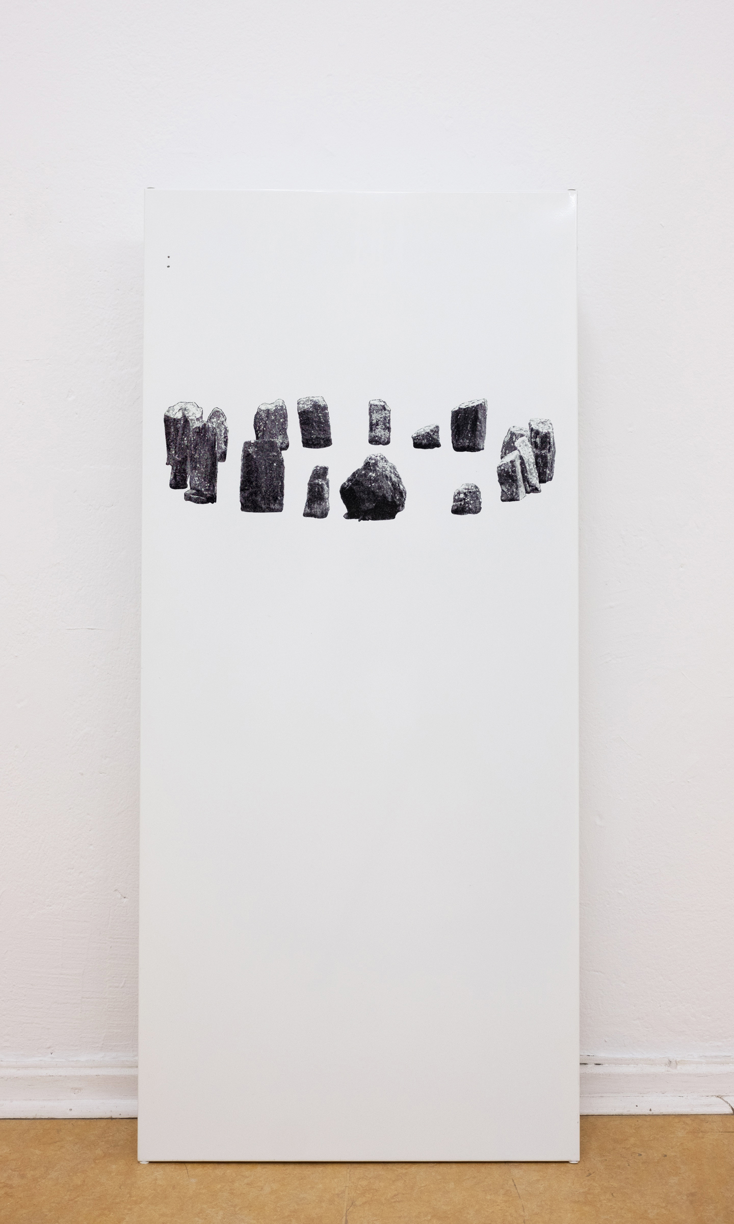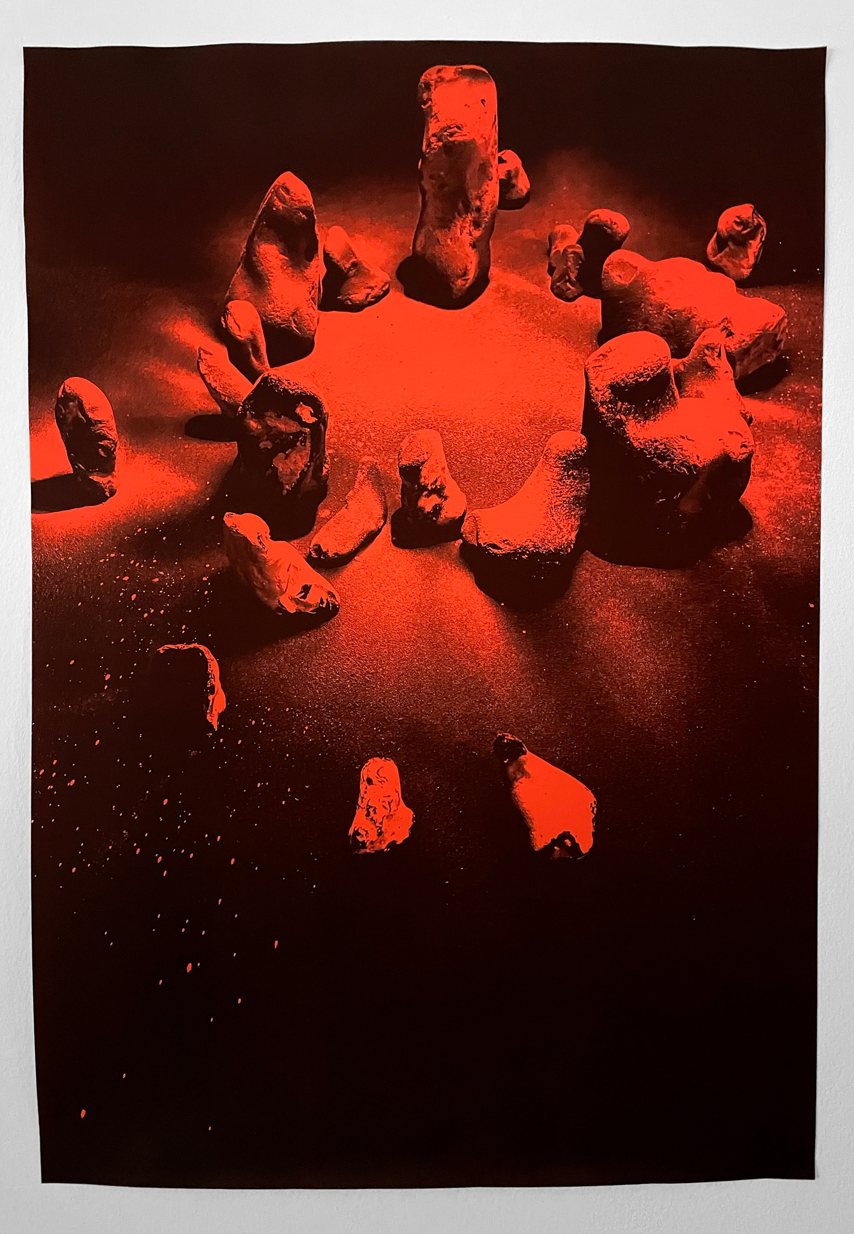 For her edition, Leykauf arranged stones on black paper and sprayed them with white chalk spray, whose many small pigment dots resemble a printing grid. The scene was then photographed in black and white and printed on red neon paper. Background and foreground are reversed as soon as the black background is applied to the colorful paper and the previously foregrounded chalk spray appears only in its absence.