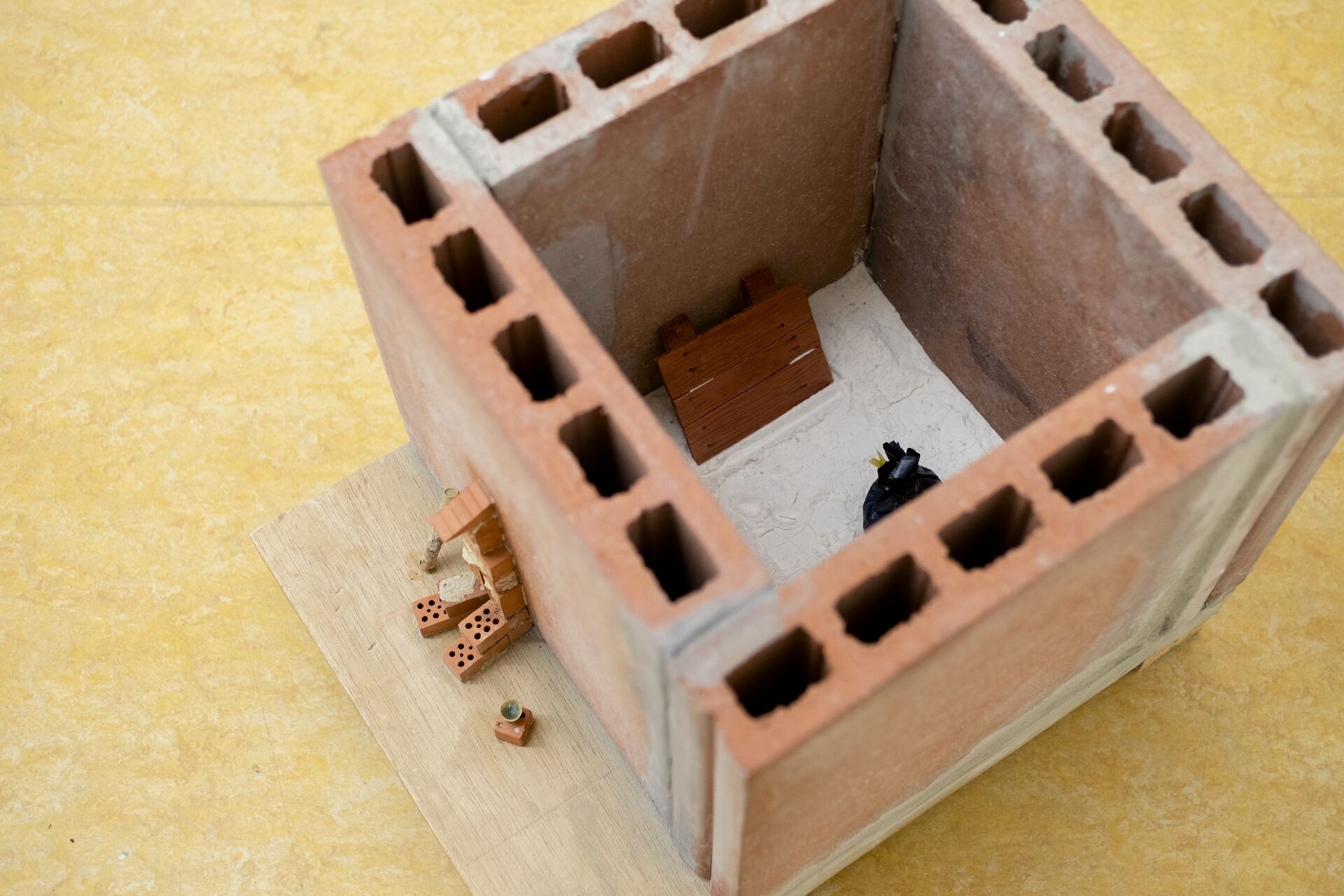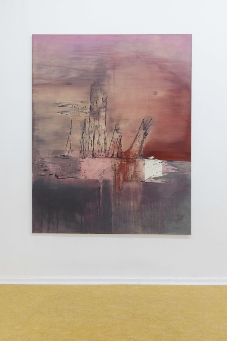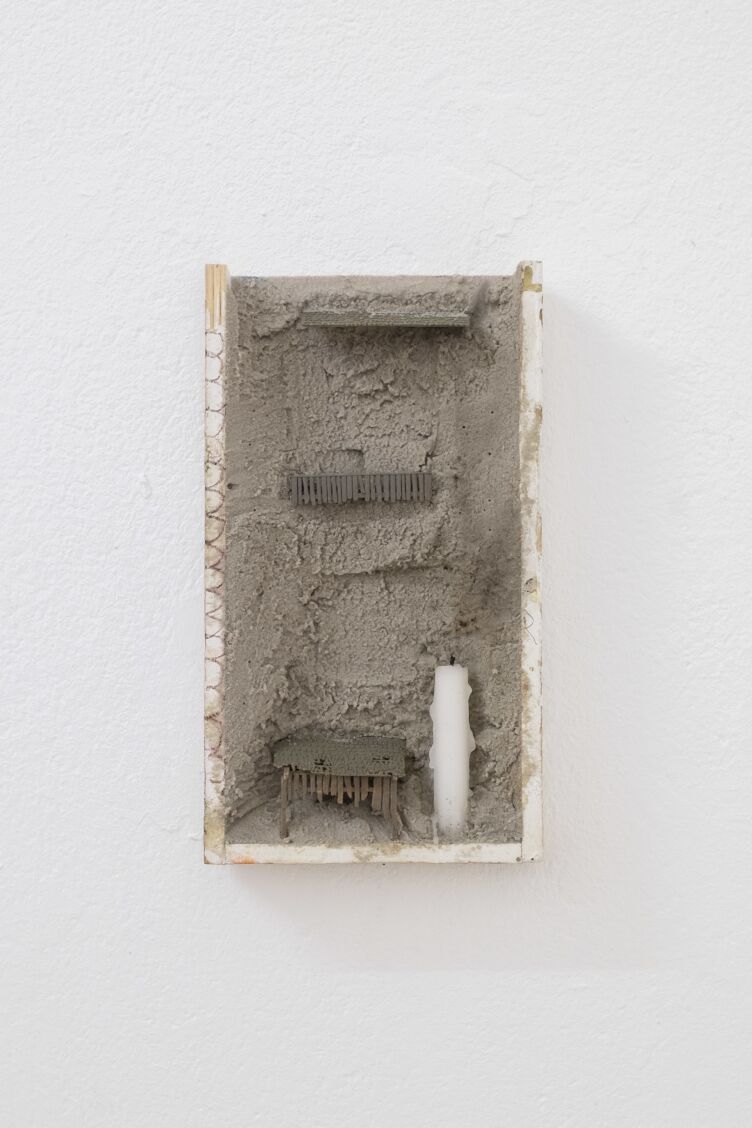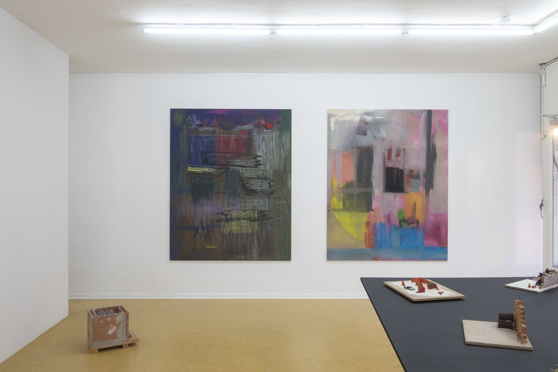 In den Malereien sind diese Einzelmotive trotz ihres isoliert-fragmentarischen Charakters zugleich auch in Räume mit einer enormen Tiefenwirkung eingebunden. Diese Tiefe ist indes nicht die gewohnter, perspektivischer Darstellung. Sie ergibt sich vielmehr in der Staffelung, im nie ganz eindeutigen Spiel eines Davor und Dahinter ganz verschiedener, sich zwischen Figürlichkeit und Farbigkeit bewegender Malschichten. In Ohne Titel (2019) erhebt sich das Motiv einer verlassenen Baumgruppe aus lasierend ineinander fließenden Farbballungen – um an einer Stelle die Unterzeichnung eines Mauerfragments aufscheinen zu lassen. Die Sichtbarriere wird zu einem Medium des Sehens. In Landwirtschaft greift dieses Spiel mit darstellerischen Konventionen und Erwartungshaltungen ins Skulptural-Räumliche aus. Hier endet ein Mauerrest just an der Stelle, an der ein aufmontierter Fensterladen die Öffnung auf eine Sichtbarkeit verspricht – um dies durch seine Nichtfunktionalität im gleichen Moment wieder zu unterlaufen. Es handelt sich also um verborgene Orte ganz unterschiedlicher Art, die sich hier eröffnen. Ebenso aber Orte faszinierender Fremdheit und utopischer Sehnsucht, nicht zuletzt Orte eines subtilen Humors. Somit kein eindeutiger Ort, der im Ausstellungstitel anklingt. Stattdessen ein Refrain: a favorite place to hide.