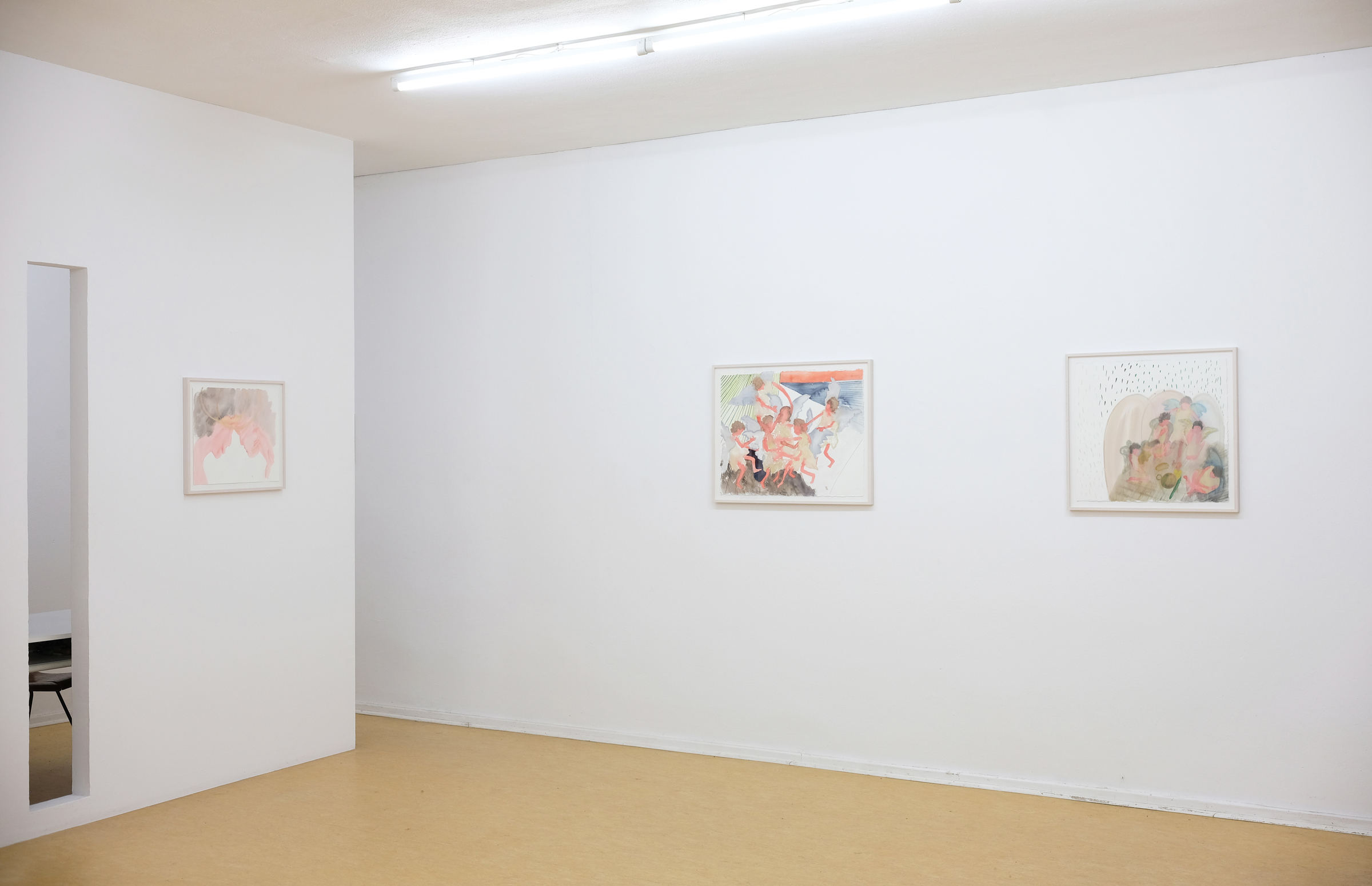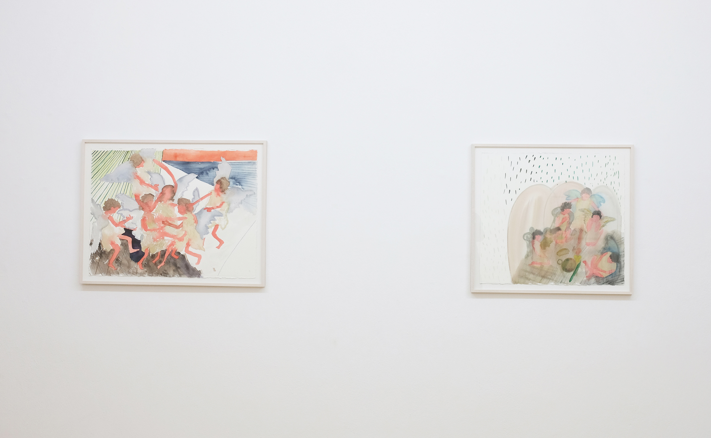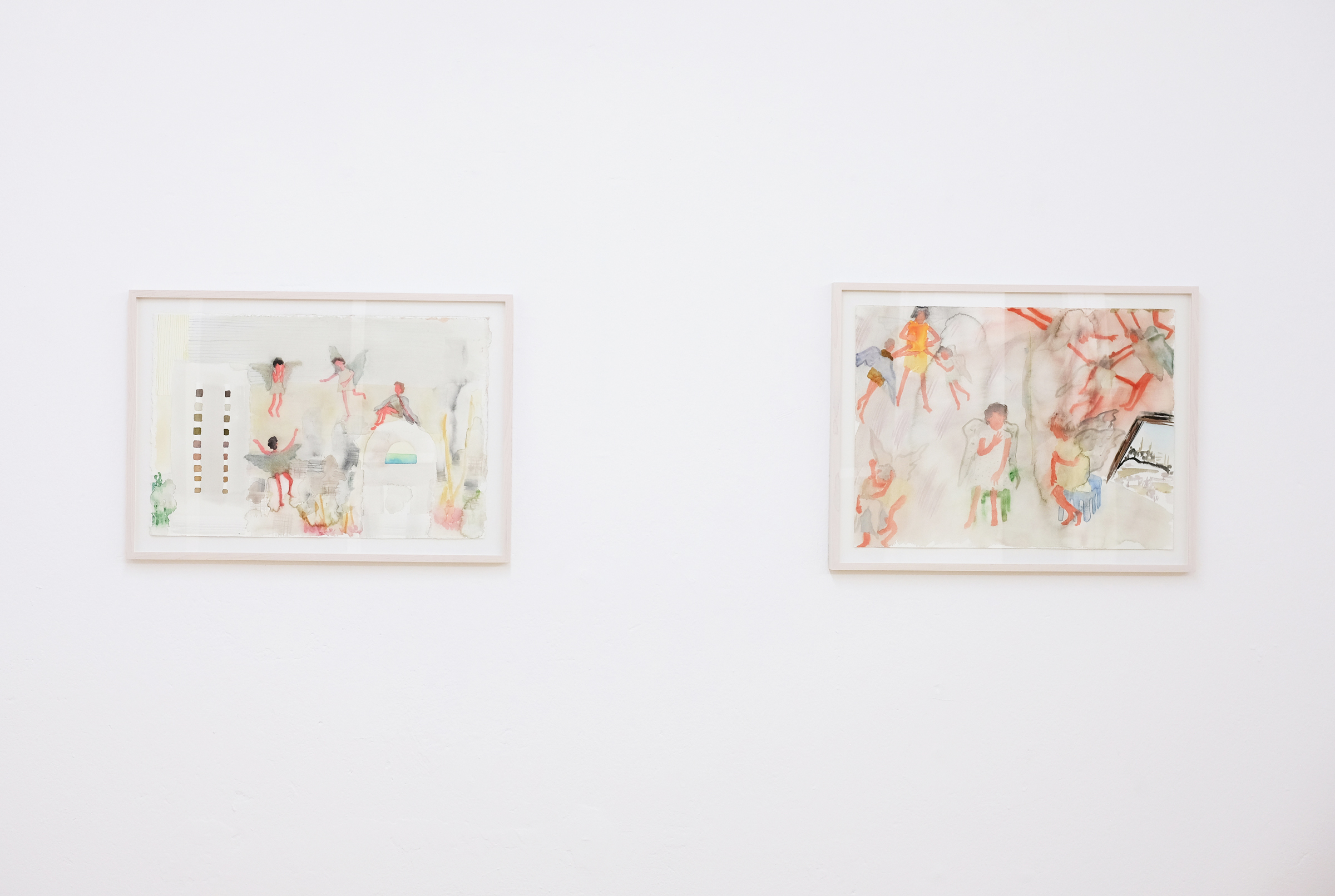 Tensions and violence appear in the paintings, as I experience them through newspapers and the internet, through the filter of the city of Berlin, through my own world of work and friends. In the watercolours, however, it is not people but angels who are beating each other up. An inner order of values seems shaken. The wish to do good to others is understood differently and the messengers resort to physical violence. There are also visible stages beyond violence: encounters, affection, mourning.