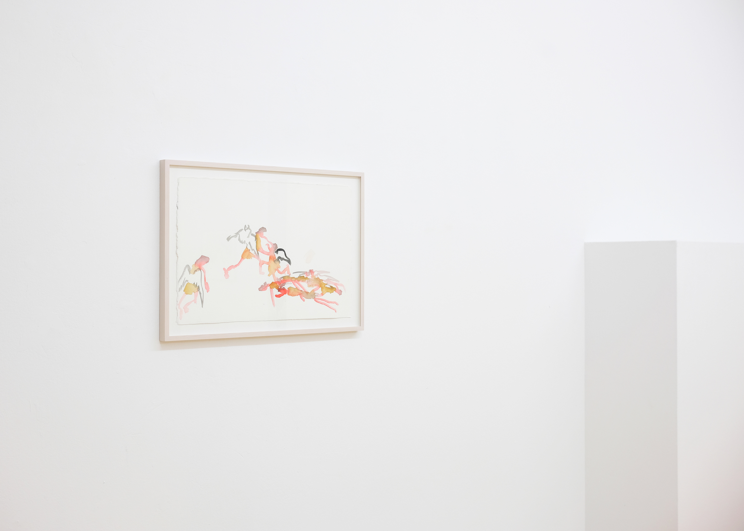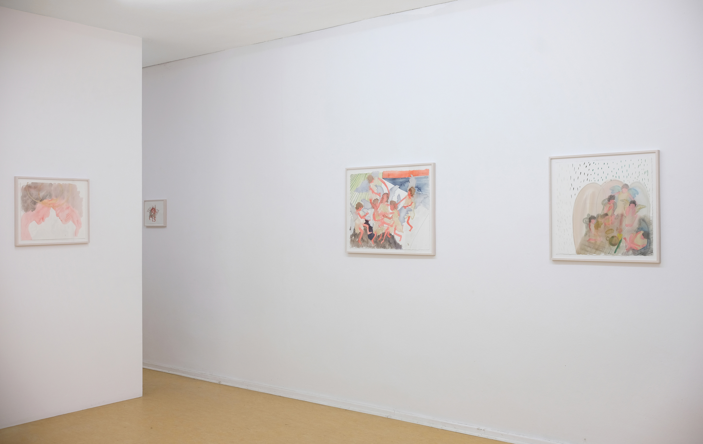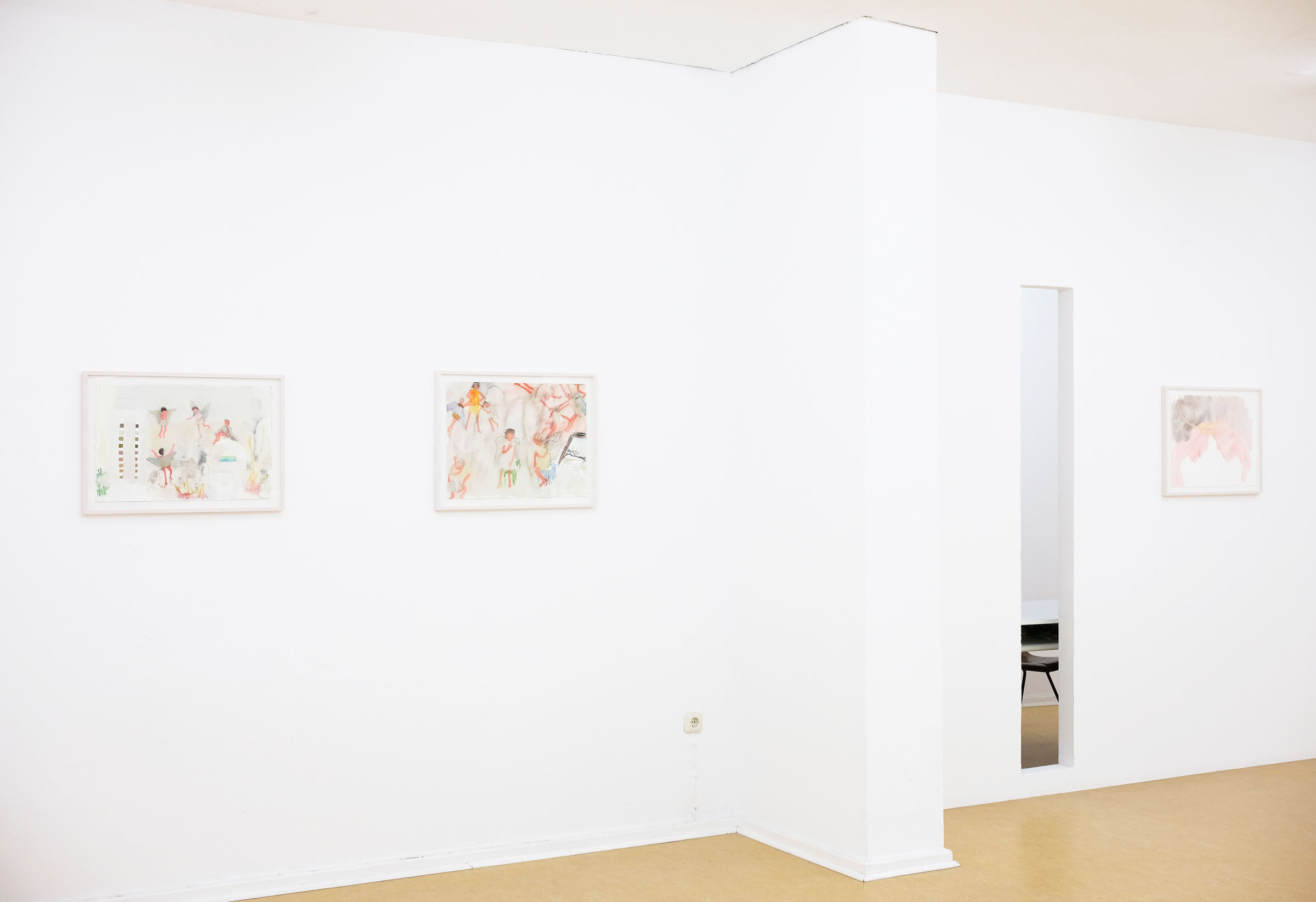 Tensions and violence appear in the paintings, as I experience them through newspapers and the internet, through the filter of the city of Berlin, through my own world of work and friends. In the watercolours, however, it is not people but angels who are beating each other up. An inner order of values seems shaken. The wish to do good to others is understood differently and the messengers resort to physical violence. There are also visible stages beyond violence: encounters, affection, mourning.