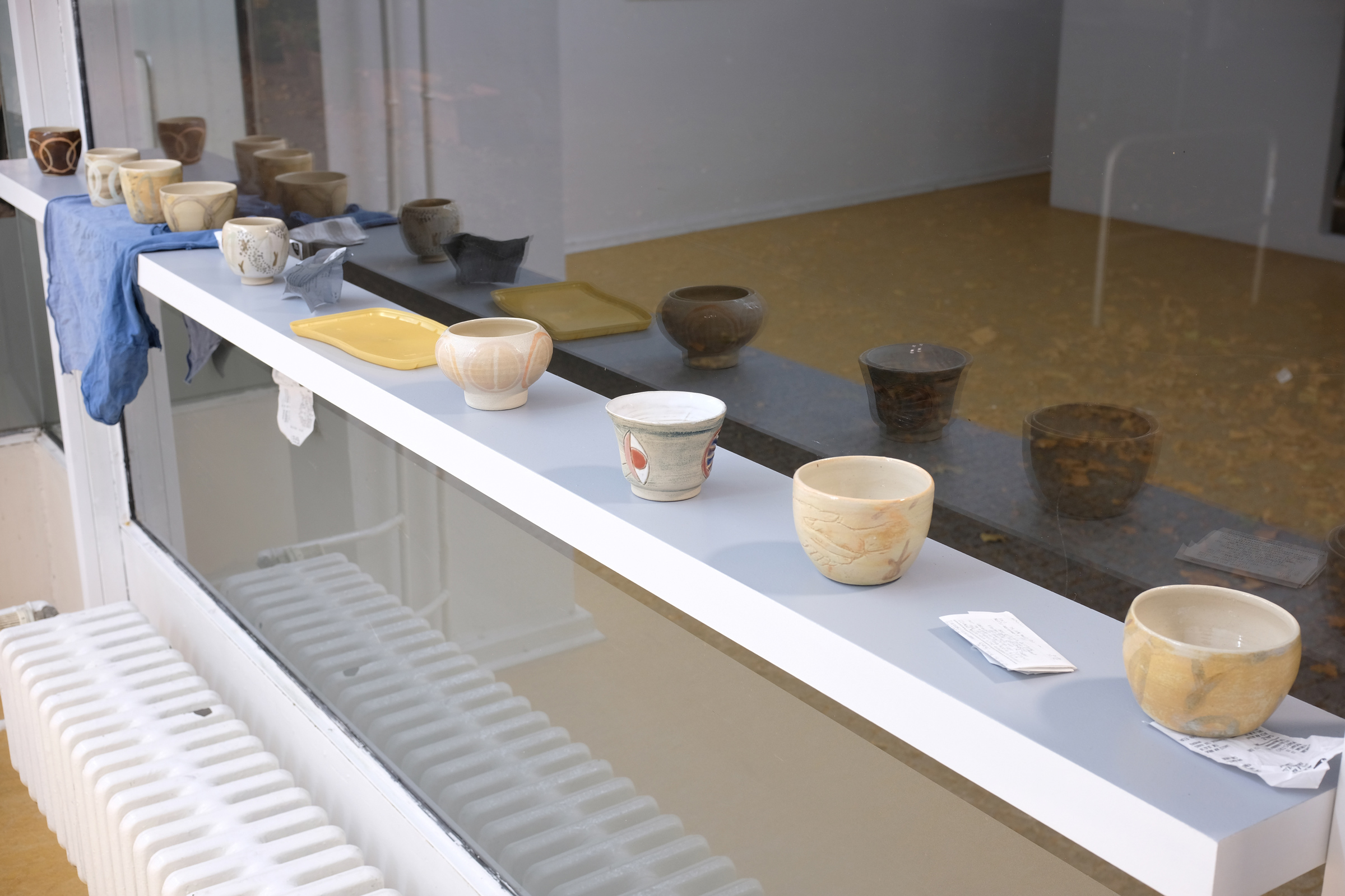 Die Becher bestehen aus Steinzeugkeramik, die bei 1240 Grad gebrannt ist. Das bedeutet, sie ist gesintert und damit lebensmittelsicher. Das Gefäß kann auch in die Spülmaschine. Die Glasuren wurden ebenfalls nach Lebensmittelsicherheit ausgewählt. Die Keramiken befinden sich zusammen mit Schaufensterdekoration auf einem Display, das sich über den Fensterrahmen mit der Ladenarchitektur verbindet. So verbinden sich die Werke im Innenraum mit dem Außenraum. Am Schaufenster kann es Blickaustausch mit den Spaziergänger:innen geben, die am Mehringplatz unterwegs sind.
